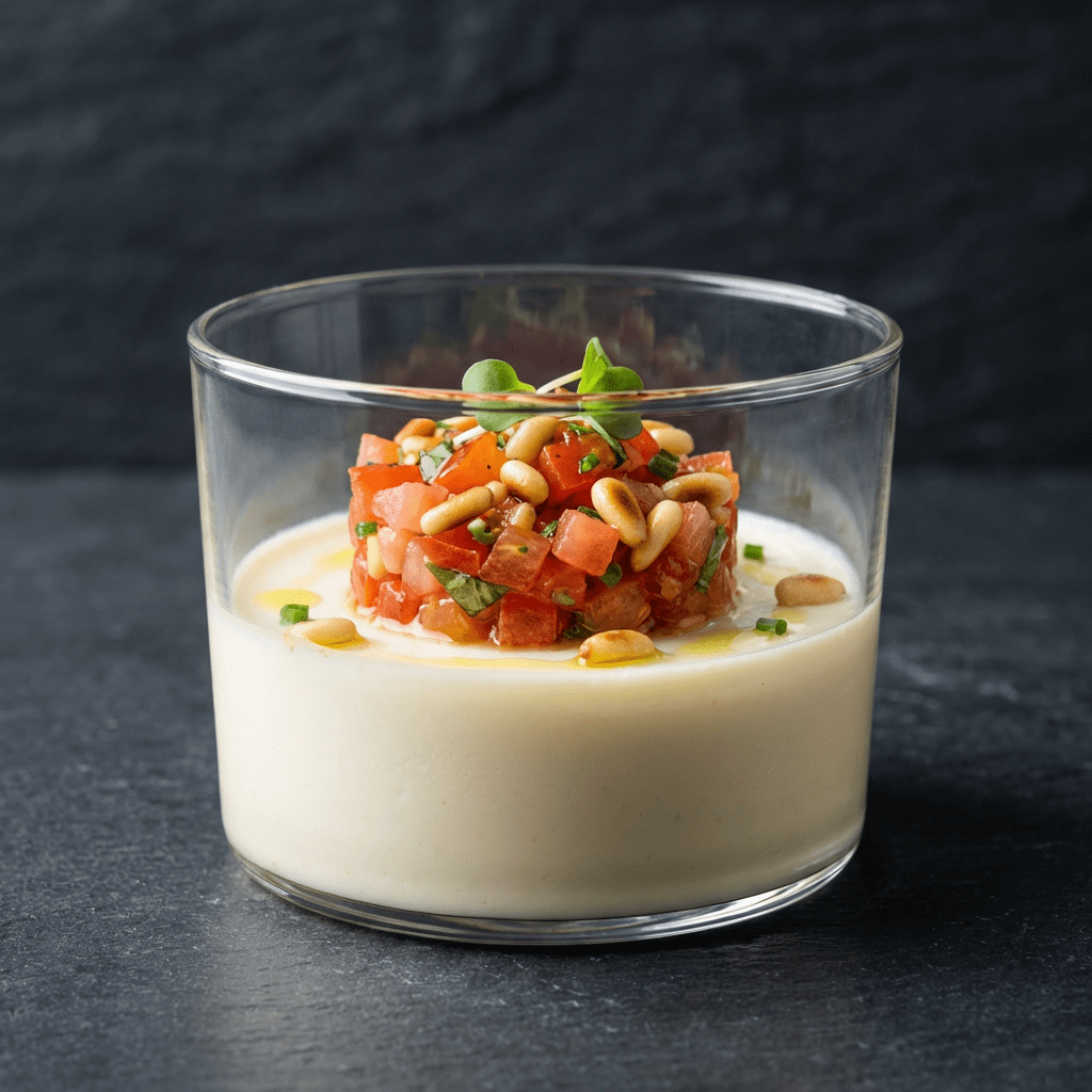 Panacotta de chèvre, tartare de tomate fraiche et confite aux pignons et herbes