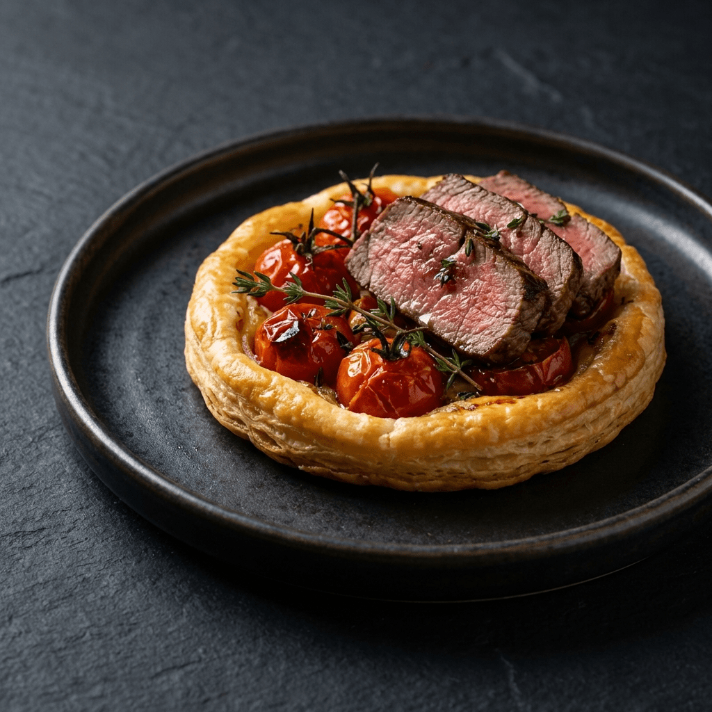 Sablé croustillant au thym, concassé de tomate aillé et sa chiffonnade de filet mignon fumé maison